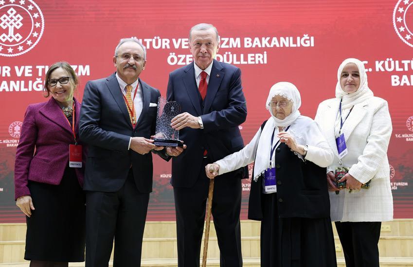 Kültür ve sanatın farklı alanlarına ilgi duyan gençlerin üstatlarından ilham alarak kendi muvaffakiyet öykülerini yazdıklarını kaydeden Erdoğan, asıl sıkıntının, ehli hünerin değerini hayattayken bilmek olduğuna dikkat çekti. Sanata ve sanatkara hürmet göstermenin lafla değil, lakin onların yapıtlarına, emeklerine, emanet ettiği mirasa sahip çıkmakla olacağını lisana getiren Erdoğan, “Hem Cumhurbaşkanlığı Kültür Sanat Büyük Mükafatları hem Bakanlığımızın özel mükafatları ile tam olarak bunu yapmanın çabasındayız. Kültür-sanat erbabımız ile kurumlarımızın milletimizin kalbinde edindikleri müstesna yeri tevdi ettiğimiz ödüllerle devlet ismine da tescilliyoruz” tabirlerini kullandı.