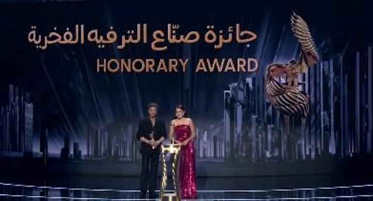 Hande Erçel ve Barış Arduç ödül merasiminde “En Uygun Arap Bayan Oyuncu” mükafatını birlikte sundular. Erçel, sahneye çıkarak Arapça konuştu.