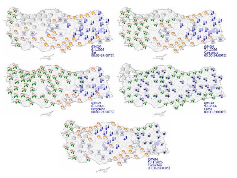 Meteoroloji Genel Müdürlüğü tarafından yapılan kestirimlere nazaran: Ülkemiz genelinin modüllü ve çok bulutlu, Kıyı Ege ile Balıkesir’in batı ilçeleri, Çanakkale, Tekirdağ, Edirne ve Kırklareli etraflarının yağmur ve sağanak yağışlı geçeceği iddia ediliyor. Rüzgarın; Marmara’nın batısı ve Kıyı Ege’de güney ve güneybatı istikametlerden kuvvetli (40-60 km/saat); Hatay’ın güneyinde, kuzey ve doğu istikametlerden kuvvetli ve kısa vadeli fırtına (40-70 km/saat) formunda esmesi bekleniyor. Sabah ve gece saatlerinde iç ve doğu bölgelerde buzlanma ve don ile birlikte pus ve yer yer sis olayı bekleniyor. Doğu Karadeniz’in iç bölümlerinin yüksekleri ile Doğu Anadolu’nun doğusunda yüksek kar örtüsüne sahip eğimli bölümlerinde çığ tehlikesi bulunmaktadır.